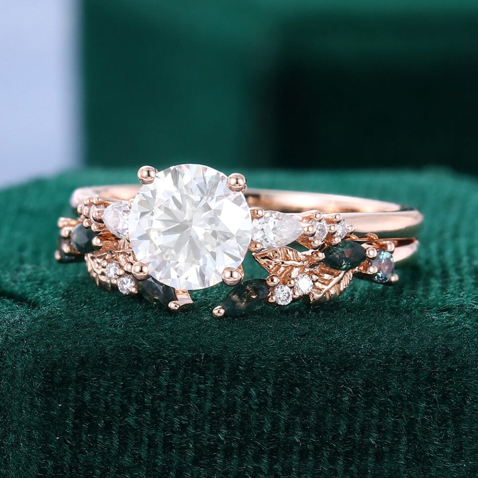 | WEDDING BAND DETAILS | STONE ▾ TYPE: Moss Agate & Lab Alexandrite& Moissanite or Natural Diamond SHAPE: Marquise & Round WEIGHT: Approx. 0.2 ct BAND ▾ WIDTH: 1.3 mm THICKNESS: 1.2 mm |